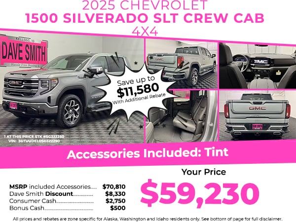 SLT Convenience Package: Ventilated Driver and Front Passenger Seats; Power Rake and Telescoping Steering Column; Premium Bose 7-Speaker Sound System; Floor-Mounted Center Console; Wireless Charging; Front Bucket Seats. SLT Preferred Package: Heated 2nd Row Outboard Seats; Power Sliding Rear Window with Rear Defogger; Adaptive Cruise Control; Universal Home Remote. SLT Premium Package: Chrome Wheel to Wheel Assist Steps; 20" Polished Aluminum Wheels. ProGrade Trailering System: In-Vehicle Trailering System App; Hitch View. Sierra Safety Plus Package: Rear Cross Traffic Braking; HD Surround Vision; Trailer Side Blind Zone Alert; Rear Pedestrian Detection; Ultrasonic Front and Rear Park Assist; Safety Alert Seat; Trailer Camera Provisions. Preferred Equipment Group 4SA: HD Rear Vision Camera; LED Cargo Area Lighting; Remote Vehicle Starter System; Electric Rear-Window Defogger; Theft Deterrent System (unauthorized Entry); Chrome Header and Chrome Grille Insert Bars; 170 Amp Alternator; Auxiliary External Transmission Oil Cooler; Front Rain-Sensing Wipers; GMC Pro Safety; Trailering Package; 120-Volt Interior Power Outlet; 2 Charge/data USB Ports; Steering Wheel Audio Controls; 2 type-C Charge-Only Rear USB Ports; Color-Keyed Carpeting Floor Covering; OnStar Services Capable; Power Front Passenger Windows with Express Up/down; Deep-Tinted Glass; 6-Speaker Audio System Feature; Power Rear Windows with Express Down; Integrated Trailer Brake Controller; SiriusXM with 360L Trial Subscription; Single Speed Transfer Case; Power Front Windows with Driver Express Up/down; Manual Tilt-Wheel and Telescoping Steering Column; Front Frame-Mounted Black Recovery Hooks; Keyless Open and Start; Wi-Fi Hotspot Capable; Perimeter Lighting; Push Button Start; Rear Wheelhouse Liners; Auto-Locking Rear Differential; Power Door Locks. 20" Polished Aluminum Wheels. Power Sunroof. Chrome Wheel to Wheel Assist Steps. Spray-On Pickup Bedliner with GMC Logo. Sterling Metallic. 275/60R20SL AT BW Tires. Dual Active Exhaust. **Equipment listed is based on original vehicle build and subject to change. Please confirm the accuracy of the included equipment by calling the dealer prior to purchase.**